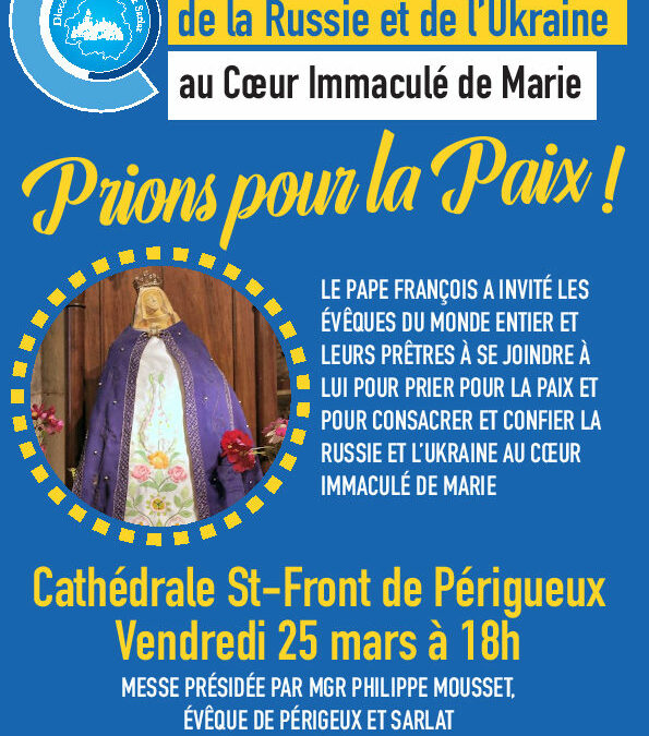 A l’invitation du Saint-Père le Pape François à prier pour la paix le 25 mars, Notre évêque Mgr Philippe MOUSSET célèbrera une messe pour la paix ce vendredi 25 mars à 18 h 00 à la cathédrale Saint-Front à Périgueux. Une messe sera célébrée au sanctuaire...