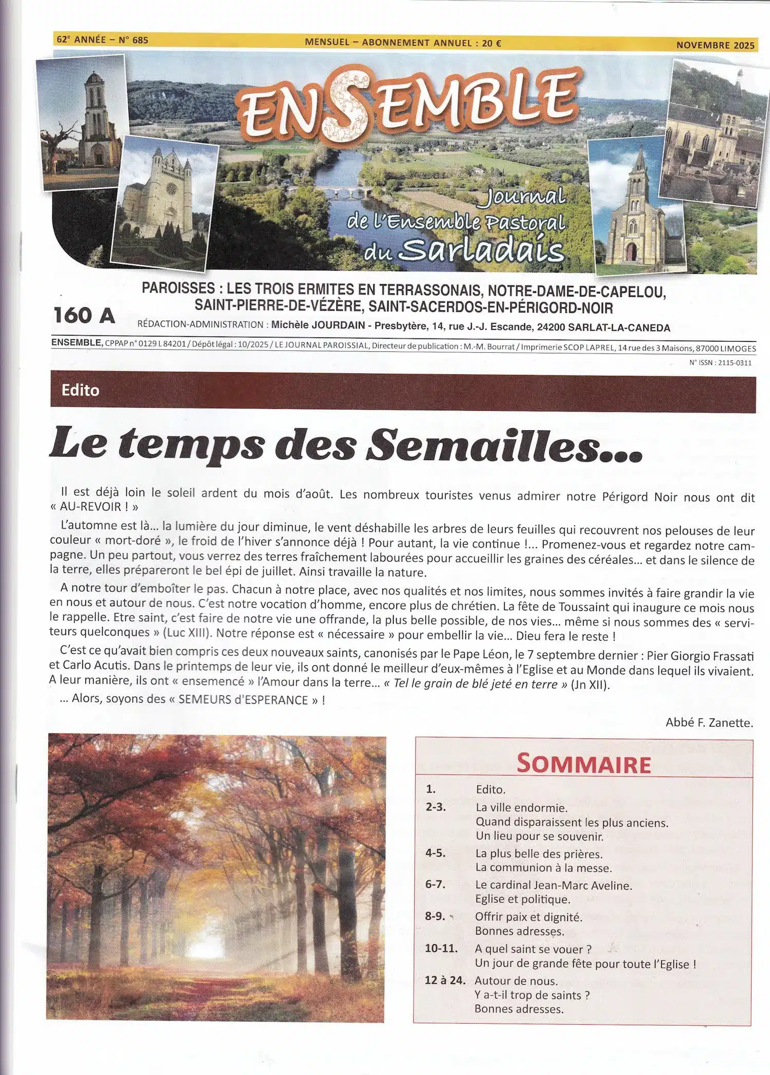 La Paroisse Actualités Présentation L’organisation Les services Les messes Les sacrements Les autres services Les sacrements, c’est quoi ? Le journal paroissial Le denier de l’Eglise L’orgue de Belvès Les Amis de l’orgue Le Festival Bach Nos églises Le journal paroissial - Ensemble Lire un journal " Ensemble " Suivez-nous Facebook Paroisse-Notre-Dame-de-Capelou Presbytère 5 rue de la Providence Belvès 24170 Pays-de-Belvès Téléphone : 05 53 29 00 59 Courriel : paroisse.nd.capelou@orange.fr ÉvènementMme Claude BEAU à St-Cyprien08/12/2025 9 h 30St-CyprienMesse à Audrix08/12/2025 16 h 00AudrixMme Suzanne GABRIEL à Ste-Foy-de-Belvès09/12/2025 8 h 30Ste Foy de BelvèsMesse, adoration et confessions au Bugue09/12/2025 9 h 15BugueMme Francine DINIES à St-Cyprien09/12/2025 10 h 00St-CyprienM. Anselme MARIGIL à St-Cyprien09/12/2025 14 h 30St-CyprienMme Colette TAILLADE à Doissat09/12/2025 15 h 00Doissat Rechercher : La Météo chez nous
